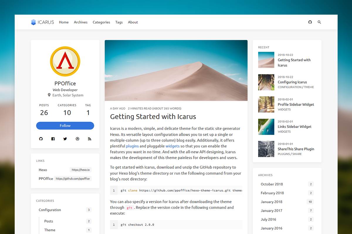 git clone https://github.com/ppoffice/hexo-theme-icarus.git themes/icarus