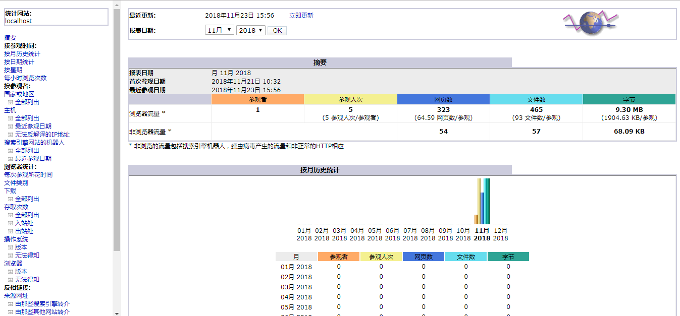 手动点击“立即更新“或自己实现定时更新。如可以设置一个 crotab -e 进行配置:0 */10 * * * curl http://localhost:8080/awstats/cgi-bin/awstats.pl?&config=localhost&month=11&year=2018&framename=mainright&update=1