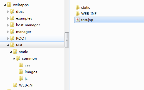 在 Apache 根目录下的 htdocs 文件夹下增加 test/static/common/images、css、js 等静态文件。