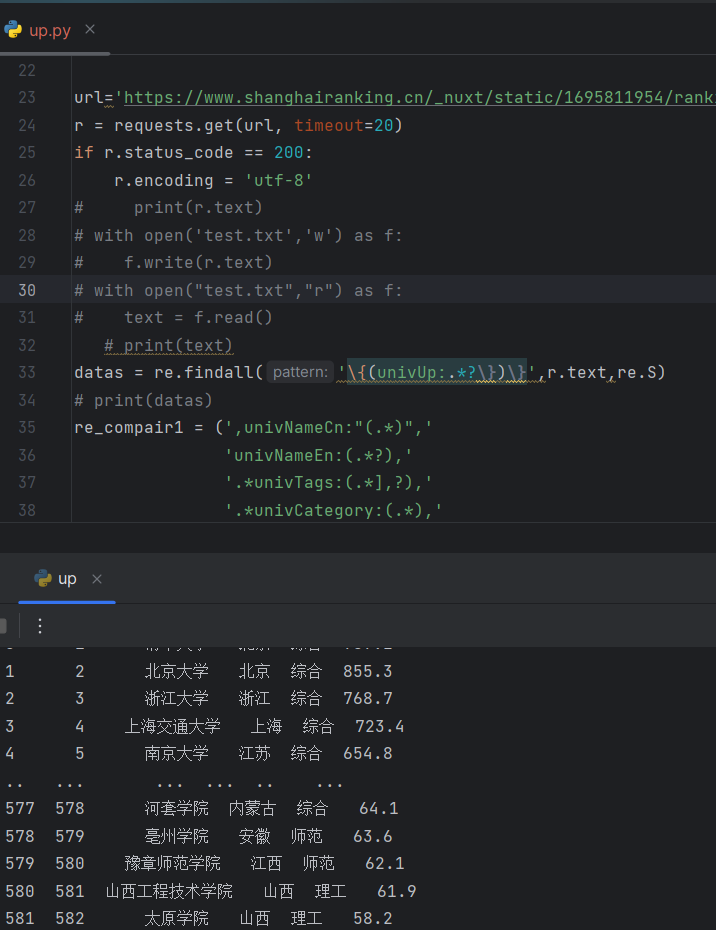 df = pd.DataFrame(dds,columns=['排名','学校','省市','类型','总分'])