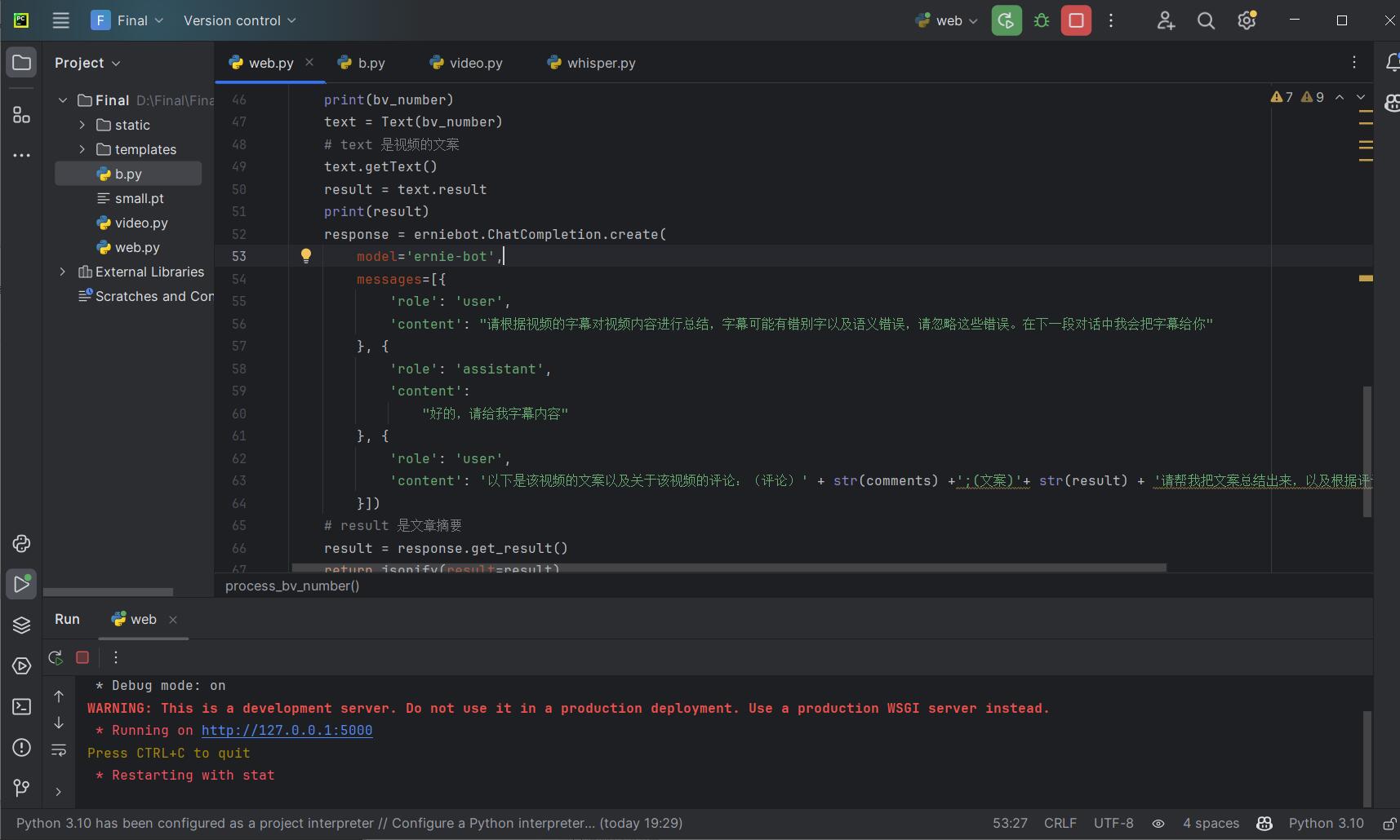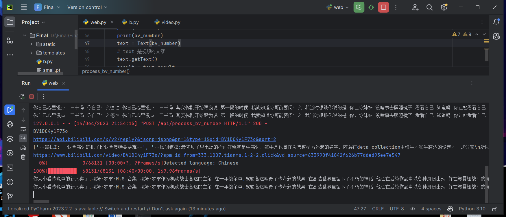 | 这个项目的目标 | (1)搭建轻量级网站平台。(2)输入视频网址,利用大模型解析视频,将音视频转文字,概括视频主要内容,同时获取评论,提炼观看者对视频内容看法。输入图片网址,提取图片上文字。(3)将上述处理结果通过搭建的web网页进行交互式输入输出。(4)性能测试与优化,提高转文字准确性,实时性,多语种,可扩展性和灵活性 |