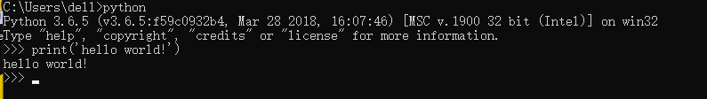 打开cmd窗口>>>输入'python'命令进入python界面>>>编辑代码,回车运行,效果如下: