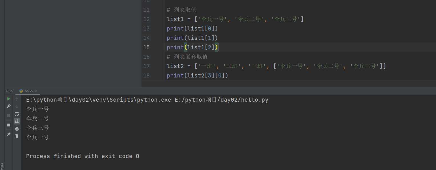 什么是列表? #中括号括起来 内部存放多个元素(数据) 元素与元素之间逗号隔开 元素可以是任意数据类型 eg:list1 = ['伞兵一号','伞兵二号','伞兵三号'] 定义:用中括号包裹,每一个数据用逗号隔开 取值:索引取值法 list1[0] = '伞兵一号' ^ 索引值 #注意:列表的索引第一位是0 list1[1] = '伞兵二号' list1[2] = '伞兵三号' 列表可以嵌套 eg:list2 = ['一班','二班','三班',['伞兵一号','伞兵二号','伞兵三号']] list2[3][0] = '伞兵一号'![]()
