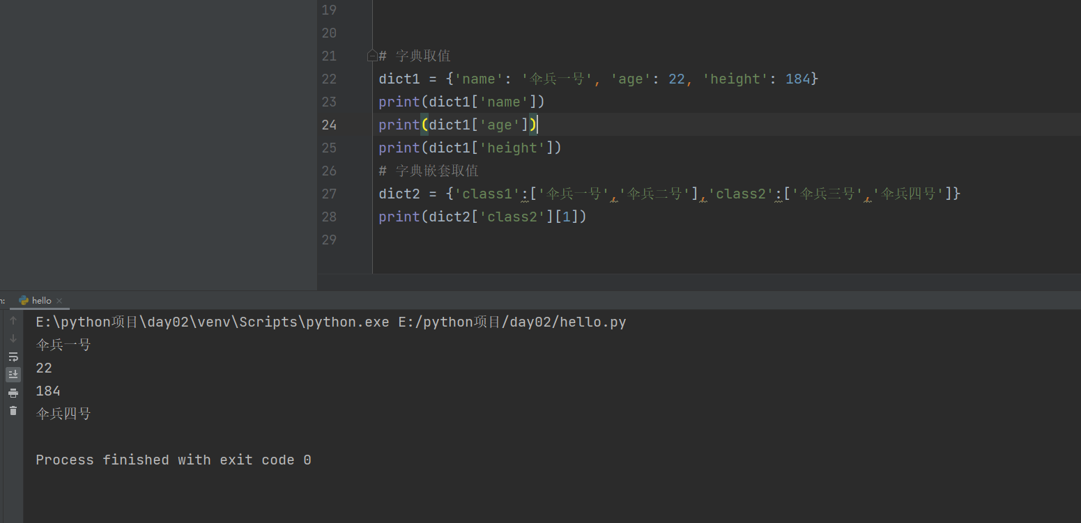 什么是字典? #字典与列表有相似之处,都是用来储存多个数据。但字典可以储存数据对应的含义,而列表不能。 eg dict1 = {'name':'伞兵一号','age':'22','height':'184'} 定义:以大括号包裹,以key:value的键值对形式存储,中间用逗号隔开 取值: dict1[name] = '伞兵一号' 字典可以嵌套 eg:dict2 = {'class1':['伞兵一号','伞兵二号'],'class2':['伞兵三号','伞兵四号']} dict2['class2'][1] = '伞兵四号'![]()