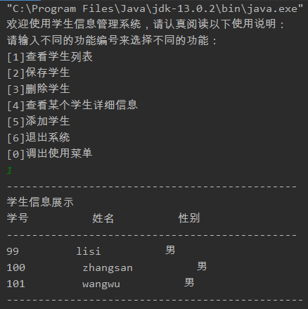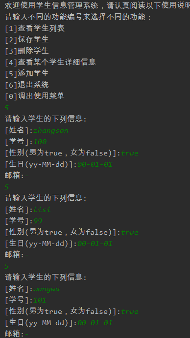 package com.cy.javase.serializable; import java.io.FileOutputStream; import java.io.IOException; import java.io.ObjectOutputStream; import java.util.*; public class StudentSystem extends Thread{ private static List<Student> students= null; @Override public void run() { //调用初始化方法读取学生信息 students= StudentSystemInitialized.initialized(); System.out.println("欢迎使用学生信息管理系统,请认真阅读以下使用说明:"); System.out.println("请输入不同的功能编号来选择不同的功能:"); System.out.println("[1]查看学生列表\n[2]保存学生\n[3]删除学生\n[4]查看某个学生详细信息\n[5]添加学生\n[6]退出系统\n[0]调出使用菜单"); while (true){ Scanner s = new Scanner(System.in); int i = s.nextInt(); switch (i){ case 0: System.out.println("[1]查看学生列表\n[2]保存学生\n[3]删除学生\n[4]查看某个学生详细信息\n[5]添加学生\n[6]退出系统\n[0]调出使用菜单"); break; case 1: System.out.println("----------------------------------------------"); System.out.println("学生信息展示"); System.out.println("学号 姓名 性别"); System.out.println("----------------------------------------------"); for (Student student:students){ System.out.println(student.getNo()+" "+student.getName()+" "+ (student.isGender()?"男":"女")); } System.out.println("-----------------------------------------------"); break; case 2: save(); break; case 3: System.out.print("请输入要删除学生信息的学号:"); deleStudent(new Scanner(System.in).nextInt()); break; case 4: System.out.print("请输入要查看学生信息的学号:"); information(new Scanner(System.in).nextInt()); break; case 5: System.out.print("请输入学生的下列信息:\n[姓名]:"); String name = new Scanner(System.in).next(); System.out.print("[学号]:"); int no = new Scanner(System.in).nextInt(); System.out.print("[性别(男为true,女为false)]:"); boolean gender = new Scanner(System.in).nextBoolean(); System.out.print("[生日(yy-MM-dd)]:"); String birth = new Scanner(System.in).next(); System.out.print("邮箱:"); String email = new Scanner(System.in).next(); addStudent(name,no,gender,birth,email); break; case 6: System.exit(0); default: } } } //添加学生功能 private void addStudent(String name, int no, boolean gender, String birth, String email){ Student stu = new Student(name, no, gender, birth, email); //根据学生学号进行排序放入ArrayList数组 if(students.size() == 0){ students.add(stu); }else { for (Student student : students) { if (student.getNo()>stu.getNo()){ students.add(students.indexOf(student),stu); return; } } students.add(stu); } } //删除学生功能 private void deleStudent(int no){ Student str = null; for (Student student:students){ if(student.getNo() == no){ str = student; } } students.remove(students.indexOf(str)); } //学生信息详情展示功能 private void information(int no){ Student str = null; for (Student student:students){ if(student.getNo() == no){ str = student; } } System.out.println("-----------------------------------------------"); System.out.println("学号:"+str.getNo()+"\n"+"姓名:"+str.getName()+"\n"+"生日:"+str.getBirth()+"\n"+"性别:"+(str.isGender()?"男":"女")+"\n"+"邮箱:"+str.getEmail()); System.out.println("-----------------------------------------------"); } //保存功能 private void save(){ ObjectOutputStream oos= null; try { //此处因idea工具Thread.currentThread().getContextClassLoader().getResource().getPath()方法读取的默认路径为类的根目录下out/production/类名 //所以序列化文件的输出地址要手写至初始化方法可读取的地址。未满足OCP原则,有待改进。 oos= new ObjectOutputStream(new FileOutputStream("out/production/day4/students")); oos.writeObject(students); oos.flush(); } catch (IOException e) { e.printStackTrace(); }finally { if(null!=oos){ try { oos.close(); } catch (IOException e) { e.printStackTrace(); } } } } }