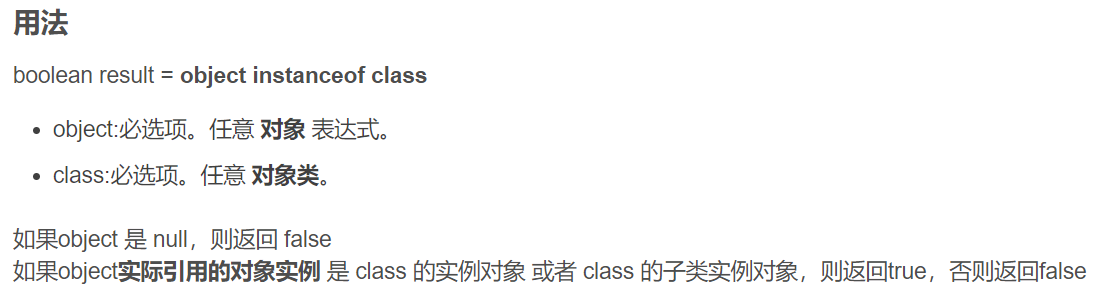 instanceof 用来判断指定 对象(实际引用的对象实例) 是否是 指定类或者指定类的子类