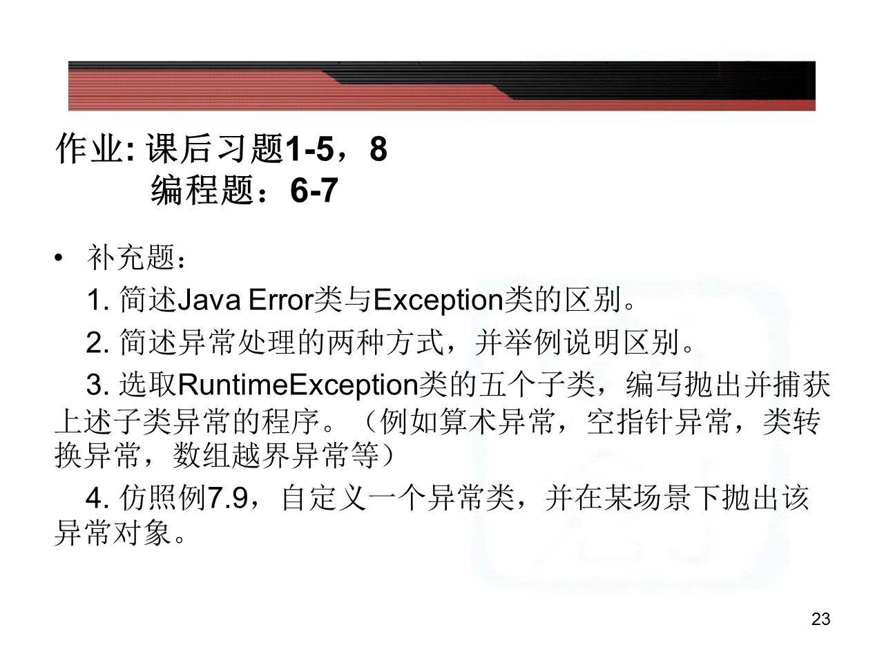 ②Exception有许多子类,都是按照包的形式组织的,程序需要应对这些异常对象进行相应的处理。