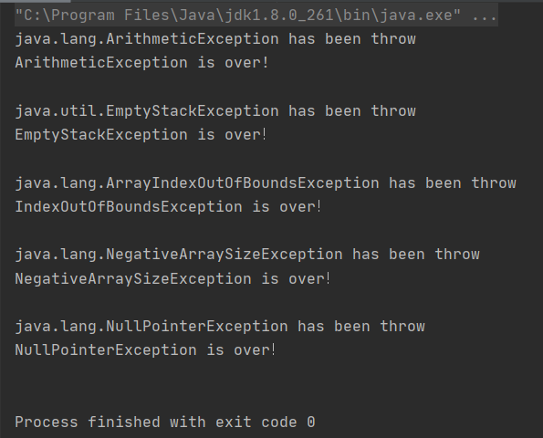 package com.company; import java.util.EmptyStackException; import java.util.Stack; class A{ int v = 1; public int getV() { return v; } } public class test { public static void Arithmetic() { int a = 1, b = 0; try{ int c = a / b; } catch (ArithmeticException ae) { System.out.println(ae.getClass().getName()+" has been throw"); } finally { System.out.println("ArithmeticException is over!\n"); } } public static void NullPointer() { try { A a = null; a.getV(); } catch (NullPointerException npe) { System.out.println(npe.getClass().getName()+" has been throw"); } finally { System.out.println("NullPointerException is over!\n"); } } public static void EmptyStack() { Stack s = new Stack(); try{ s.pop(); System.out.println("Pop"); } catch (EmptyStackException ese) { System.out.println(ese.getClass().getName()+" has been throw"); } finally { System.out.println("EmptyStackException is over!\n"); } } public static void IndexOutOfBounds() { int[] a = new int[3]; for (int i = 0; i<3 ; i++ ) { a[i] = i; } try{ System.out.println(a[4]); } catch (IndexOutOfBoundsException ioe) { System.out.println(ioe.getClass().getName()+" has been throw"); } finally { System.out.println("IndexOutOfBoundsException is over!\n"); } } public static void NegativeArraySize() { try{ int[] a = new int[-3]; } catch (NegativeArraySizeException nase) { System.out.println(nase.getClass().getName()+" has been throw"); } finally { System.out.println("NegativeArraySizeException is over!\n"); } } public static void main(String[] args) { test.Arithmetic(); test.EmptyStack(); test.IndexOutOfBounds(); test.NegativeArraySize(); test.NullPointer(); } }