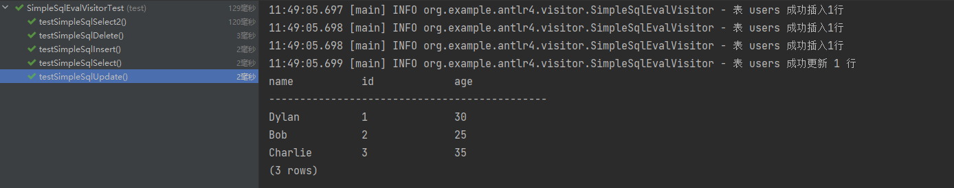编写 SQL Parser 的测试用例,执行 CRUD 操作,验证 SQL 执行的结果准确性: