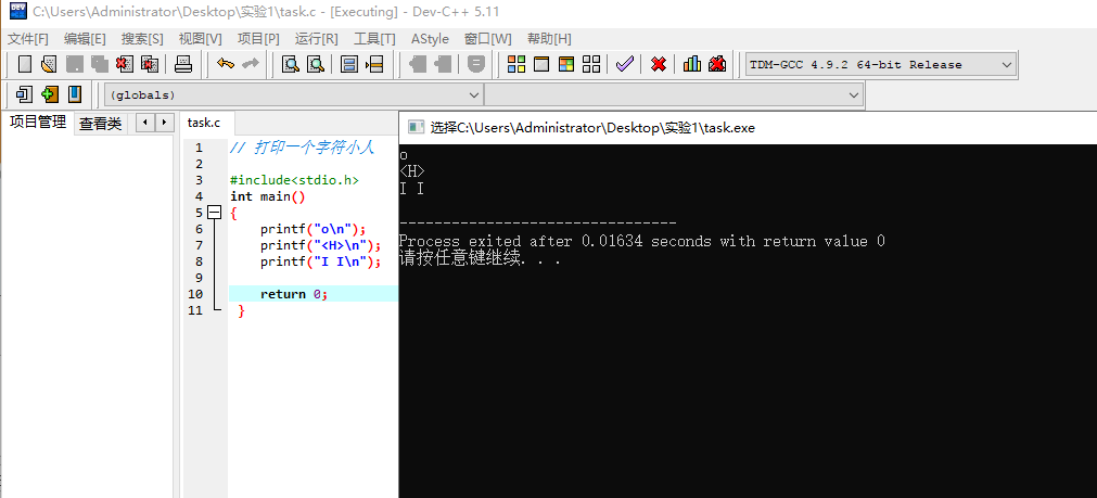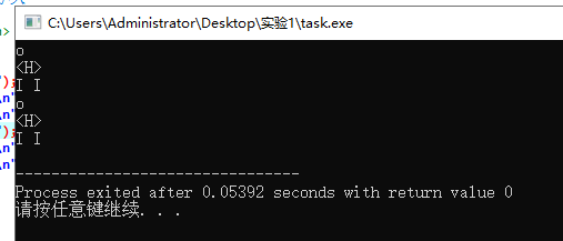 // 打印一个字符小人 #include<stdio.h> int main() { printf("o\n"); printf("<H>\n"); printf("I I\n"); return 0; }