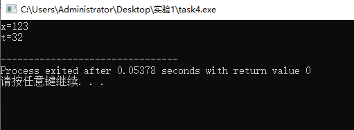 #include <stdio.h> int main() { int x,t,m; x=123; printf("x=%d\n",x); t=0; m=x%10; t=t*10+m; x=x/10; m=x%10; t=t*10+m; x=x/10; printf("t=%d\n",t); return 0; }