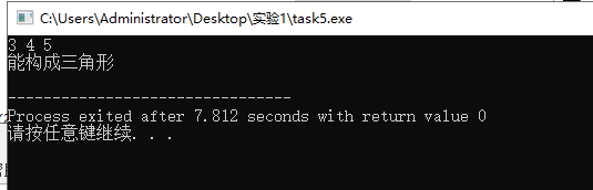 //从键盘上输入三个数据作为三角形边长,判断其是否能构成三角形 //构成三角形的条件:任意两边之和大于第三边 #include<stdio.h> int main() { float a,b,c; //输入三边边长 scanf("%f%f%f",&a,&b,&c); //判断能否构成三角形 //补足括号里的逻辑表达式 if(a+b>c) printf("能构成三角形\n"); else printf("不能构成三角形") ; return 0; }