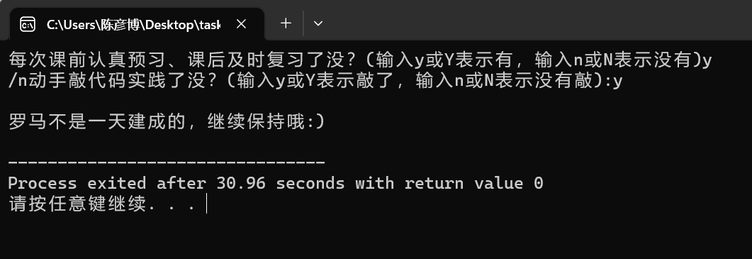 #include<stdio.h> int main() { char ans1,ans2; printf("每次课前认真预习、课后及时复习了没?(输入y或Y表示有,输入n或N表示没有)"); ans1=getchar();//从键盘输入一个字符,赋值给ans1 getchar ();// printf("/n动手敲代码实践了没?(输入y或Y表示敲了,输入n或N表示没有敲):"); ans2=getchar(); if( (ans1=='Y'||ans1=='y')&&(ans2=='Y'||ans2=='y')) printf("\n罗马不是一天建成的,继续保持哦:)\n"); else printf("\n罗马不是一天毁灭的,我们来建设吧\n"); return 0; }