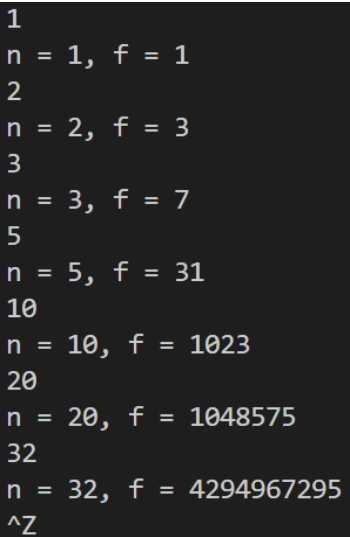 #include<stdio.h> long long func(int n); int main(){ int n; long long f; while (scanf("%d",&n) !=EOF){ f = func(n); printf("n=%d,f=%11d\n",n,f); } return 0; } long long func(int n) { long long int f; if(n==1) f=1; else f=2*func(n-1)+1; return f; }