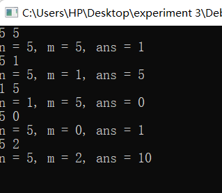 #include <stdio.h> int func(int n, int m); int ans=0;int main() { int n, m; while(scanf("%d%d", &n, &m) != EOF) printf("n = %d, m = %d, ans = %d\n", n, m, func(n, m)); return 0; } int func(int n, int m){ if(n==m) ans=1; if(m==0) ans=1; if(n<m) ans=0; if(n>m) { if( m !=0) ans = func(n-1,m)+func(n-1,m-1); else ans=1; } return ans; }