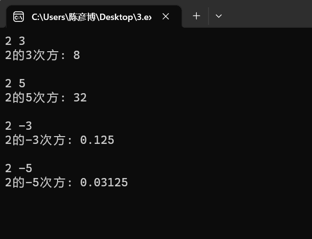 #include <stdio.h> double mypow(int x, int y); int main() { int x, y; double ans; while(scanf("%d%d", &x, &y) != EOF) { ans = mypow(x, y); printf("%d的%d次方: %g\n\n", x, y, ans); } return 0; } double mypow(int x, int y) { double ans=1; if(y==0) ans=1; if(y>0) ans=ans*x*mypow(x,y-1); if(y<0) ans=ans/x*mypow(x,y+1);