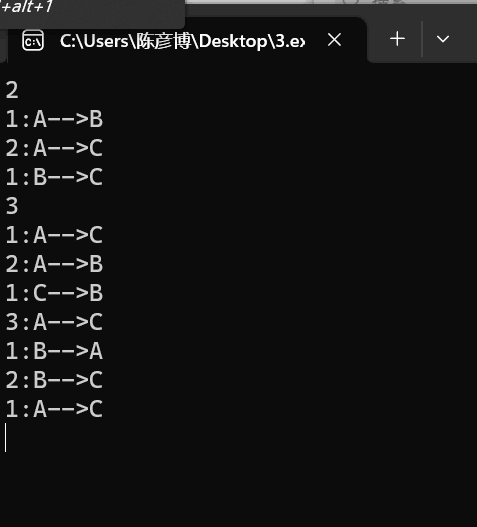 #include<stdio.h> #include<stdlib.h> void hanoi(unsigned int n,char from, char temp, char to); void moveplate(unsigned int nth,char from,char to); int main(){ unsigned int n; while(scanf("%u",&n) !=EOF) hanoi(n,'A','B','C'); return 0; } void hanoi(unsigned n,char from, char temp, char to){ if(n==1){ moveplate(n,from,to); } else { hanoi(n-1,from,to,temp); moveplate(n,from,to); hanoi(n-1,temp,from,to); } } void moveplate(unsigned nth,char from,char to){ printf("%u:%c-->%c\n",nth,from,to); }
