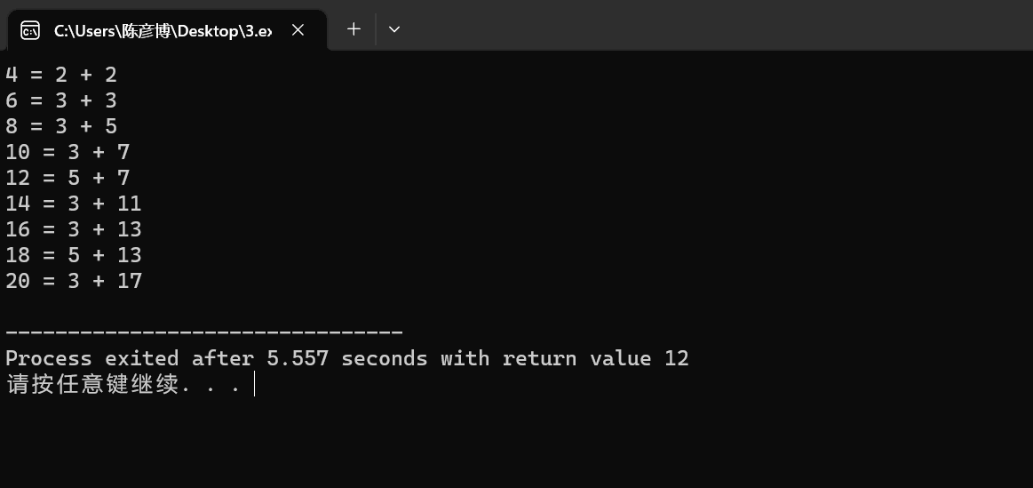#include <stdio.h> int is_prime(int n); int main(){ int i,j,k; for(i=2;i<=10;i++){ for(j=2;j<=i;j++){ if(is_prime(2*i - j) == 1 && is_prime(j) == 1) { printf("%d = %d + %d\n", 2*i, j, 2*i - j); break; } } } } int is_prime(int n) { int i; for( i = 2; i < n; i++) { if(n % i == 0) return 0; } return 1; }