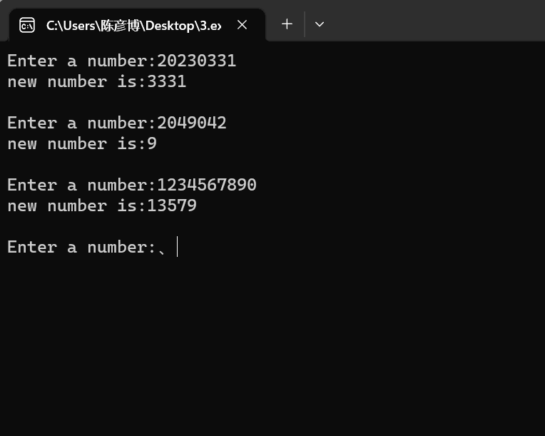 #include <stdio.h> #include <stdlib.h> #include <math.h> long func(long s); int main(){ long s,t,i,m,n,k; printf("Enter a number:"); while(scanf("%ld",&s)!=EOF){ t=func(s); printf("new number is:%ld\n\n",t); printf("Enter a number:"); } system("pause"); return 0; } long func(long s){long i,n,k,m=0; for(i=s,k=0;i>0;k++){ n=i%10; i=i/10; if ((n%2==0)||n==0) k--; else m=m+n*(pow(10,k));} return m;}