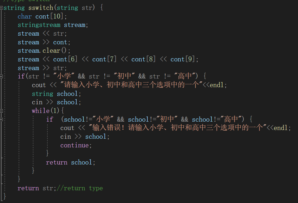 在该sswitch函数中,使用stringstream函数将字符串转为char数组,也可以使用c_str,c_str函数的返回值是const char*的,不能直接赋值给char*,所以就需要进行相应的操作转化「通过strcpy函数」。
