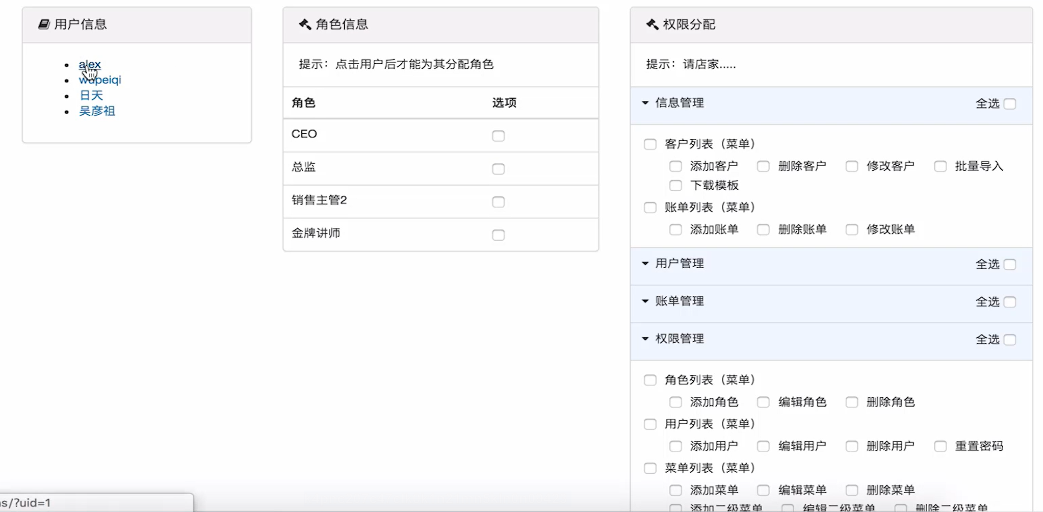 return HttpResponse('请选择用户,然后再分配角色!')