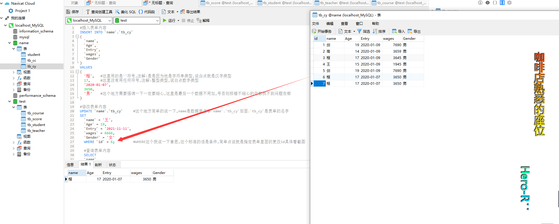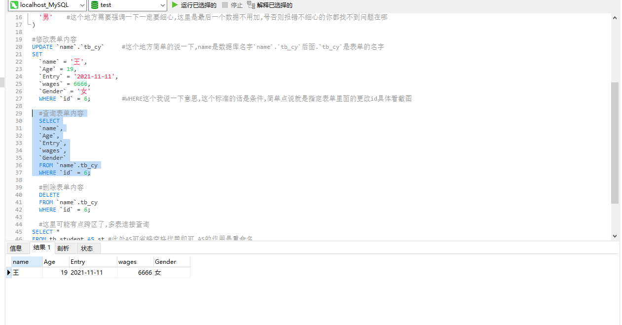 UPDATE `name`.`tb_cy` #这个地方简单的说一下,name是数据库名字`name`.`tb_cy`后面.`tb_cy`是表单的名字