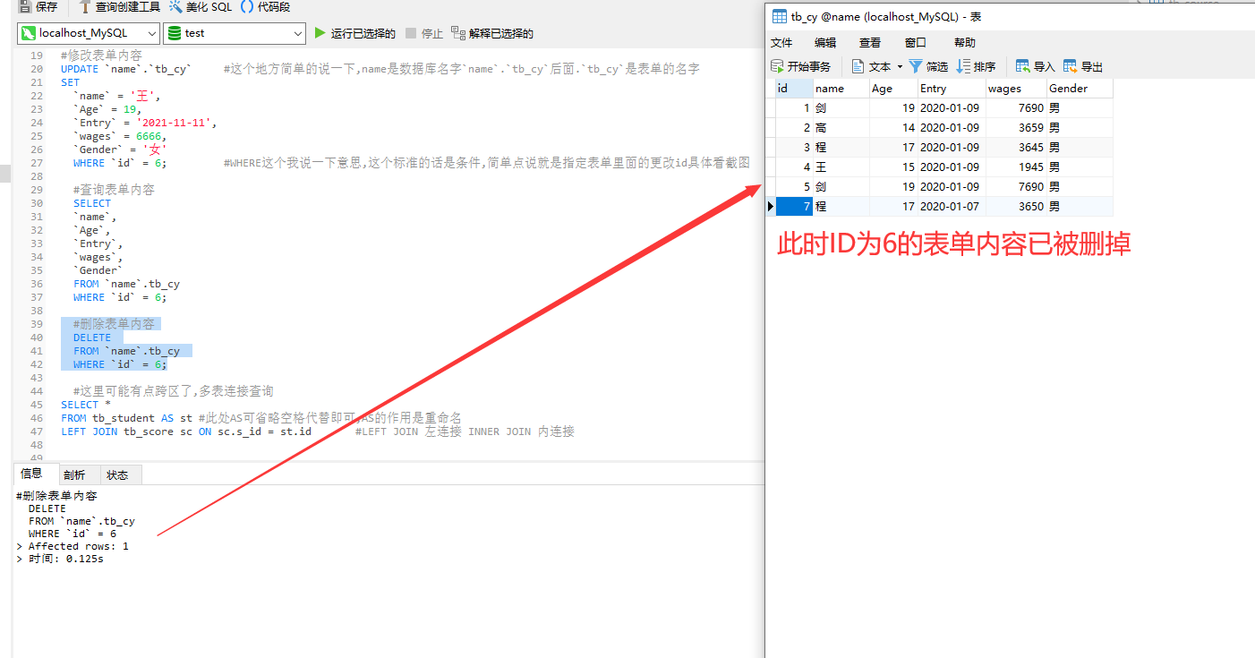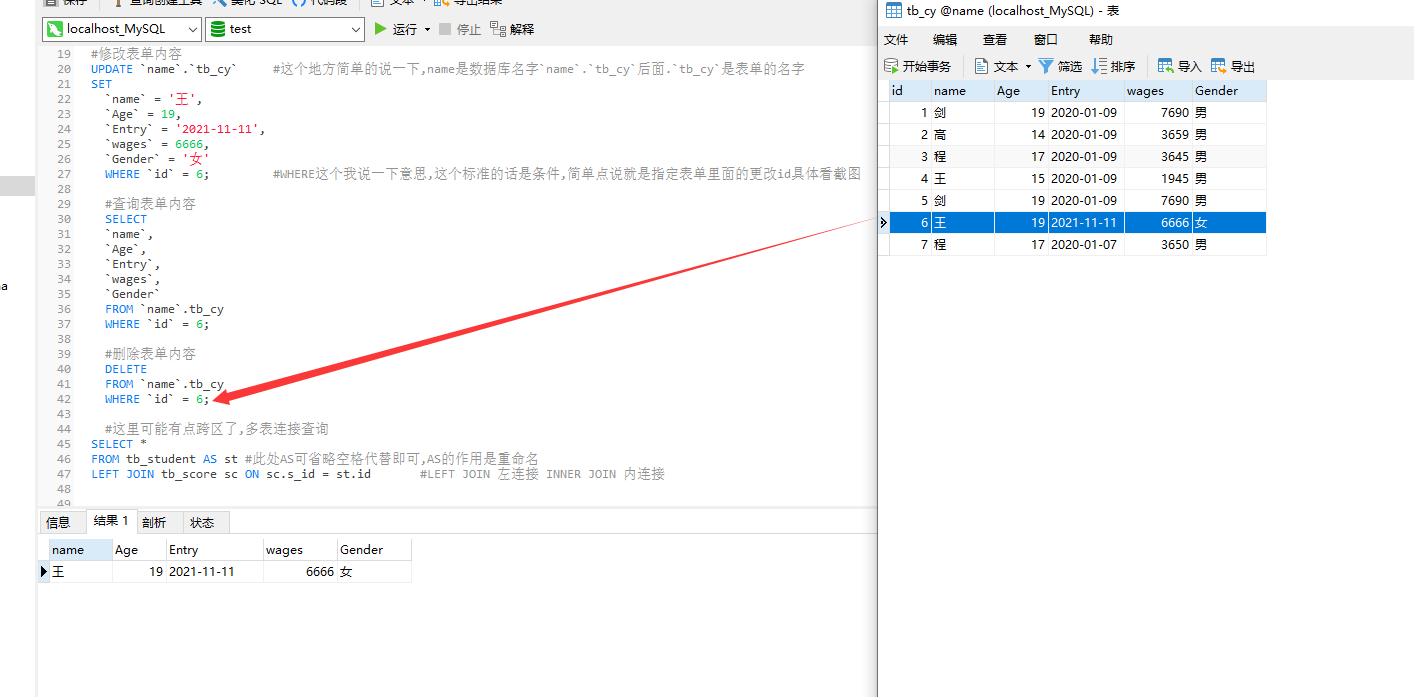 WHERE `id` = 6; #WHERE这个我说一下意思,这个标准的话是条件,简单点说就是指定表单里面的更改id具体看截图