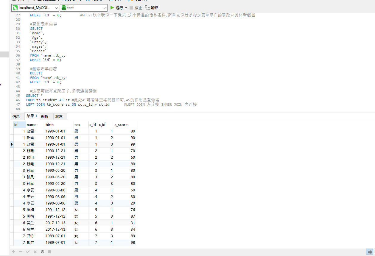 LEFT JOIN tb_score sc ON sc.s_id = st.id #LEFT JOIN 左连接 INNER JOIN 内连接