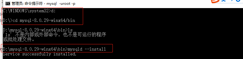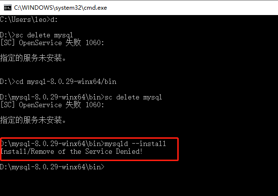 注意点:如果先前在电脑中装过mysql,请在cmd命令窗口输入sc delete mysql 删除之前的mysql服务。第一次安装请忽略 , 如下图所示: