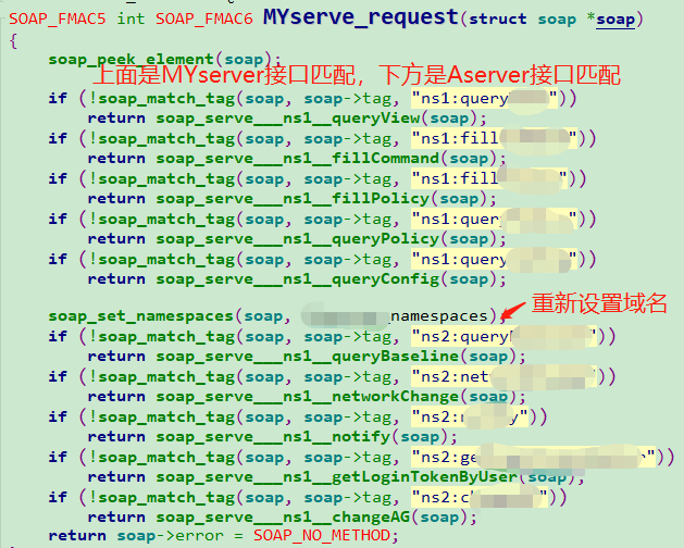 B 服务守护进程soap_accept()成功,会调用MYserver_server()函数解析报文,并在MYserver_request()接口将其分配到对应接口。// MYserver是第一步中我举例子重命名的