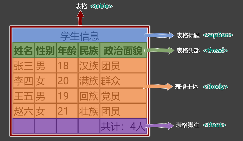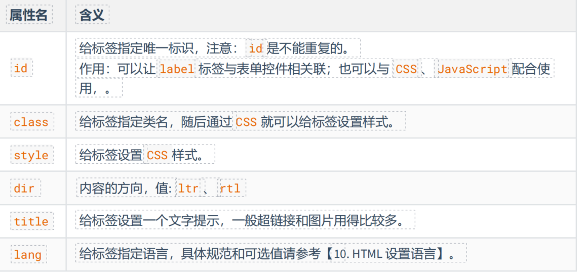 标签名 | 标签语义 | 常用属性 | 单双标签 | 属于 |