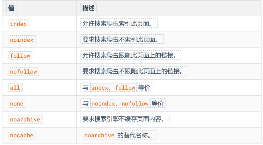 <meta name="robots" content="此处可选值见下表">