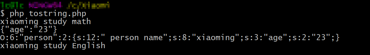 1 class person{ 2 3 private $name ; 4 public $age; 5 6 public function __construct($name , $age) 7 { 8 $this->name = $name; 9 $this->age = $age; 10 } 11 12 public function study($crose){ 13 echo $this->name . ' study ' . $crose . PHP_EOL; 14 } 15 16 public function __toString() 17 { 18 // TODO: Implement __toString() method. 19 return json_encode($this); 20 } 21 22 } 23 24 25 $person = new person('xiaoming', '23'); 26 27 $person->study('math'); 28 29 echo $person; 30 31 echo PHP_EOL; 32 33 $ser = serialize($person); 34 35 echo $ser .PHP_EOL; 36 37 $newPerson = unserialize($ser); 38 39 $newPerson->study('English');