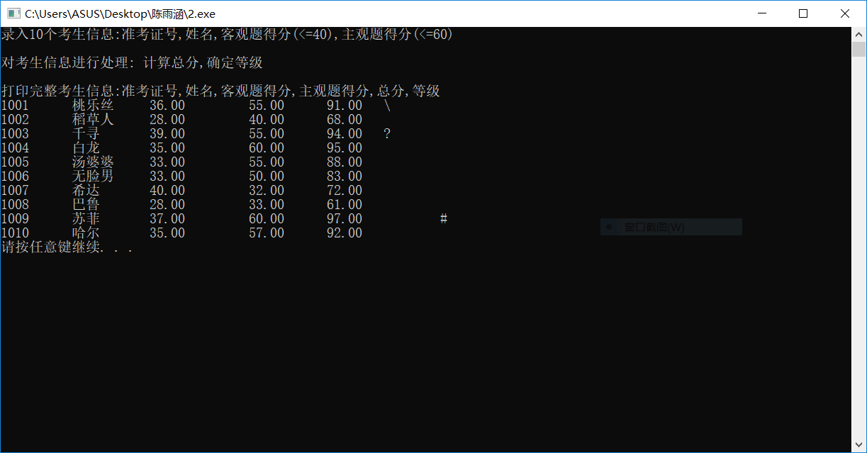 printf("\n打印完整考生信息:准考证号,姓名,客观题得分,主观题得分,总分,等级\n");