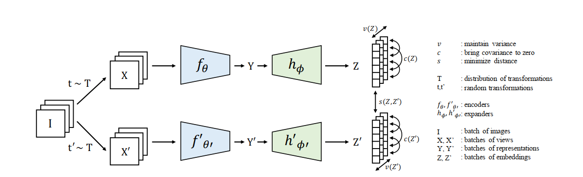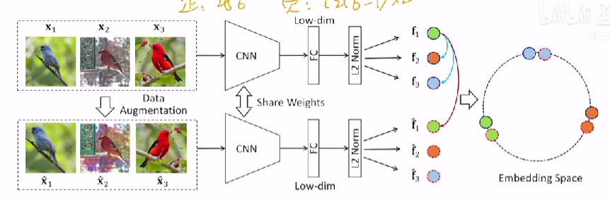 | SimCLR (继承InvSpread) | 加了个projection head(MLP、ReLU) 更大的 batch size, 数据增强 | ![]() |