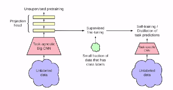 | SimCLR V2 | 更大的backbone,两层MLP,动量编码器,半监督学习 | ![]() |