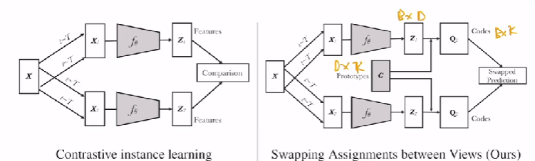 | SwAV | 换位预测,使用了聚类,和聚类中心做对比, multi-crop很有用 | ![]() |