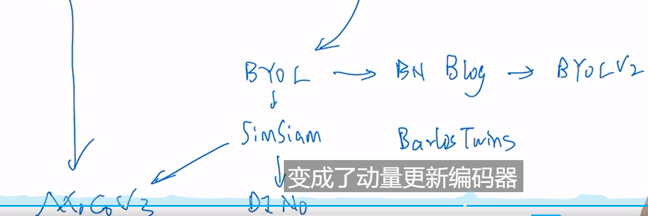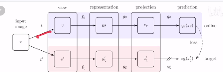 | BYOL | 预测 | 不用负样本、下面分支用动量更新, projection head, 隐式的对比学习 | ![]() |