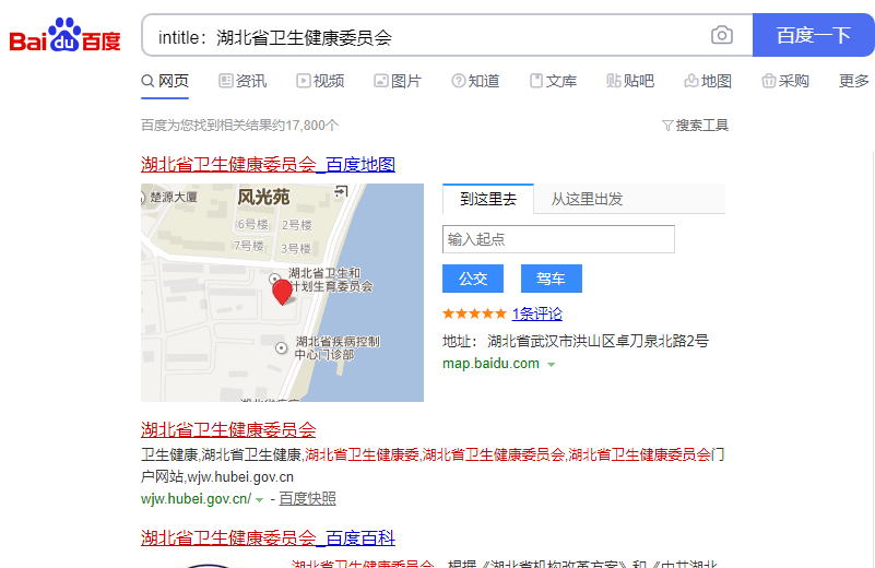 以湖北省卫健委官网为例:intitle:湖北省卫生健康委员会。搜索的页面标题必然包含“湖北省卫生健康委员会”。