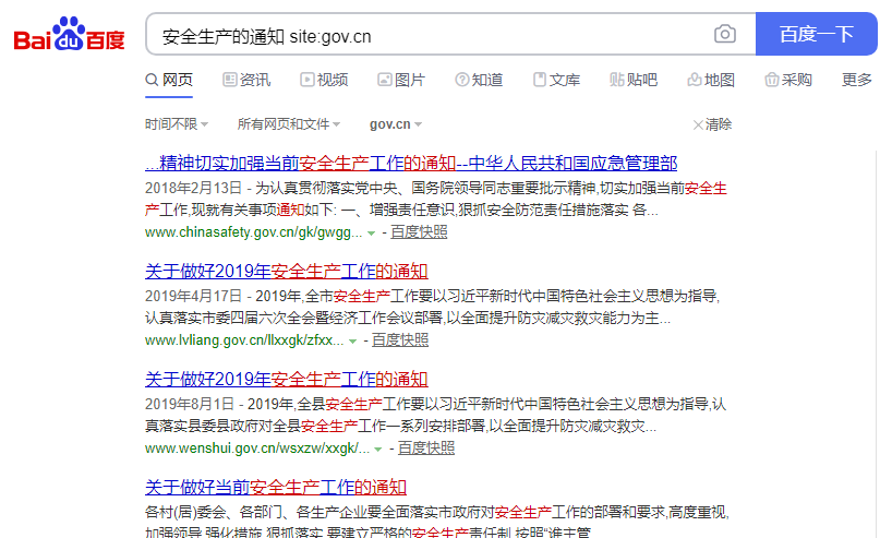 1.在特定网址搜索特定文章,例:安全生产的通知 inurl:gov.cn(关键词+空格+inurl+英文冒号+网址后缀)