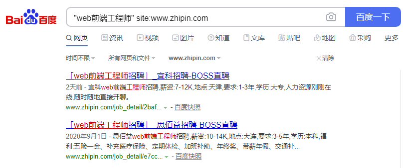3.在某网站搜索固定内容,例:"web前端工程师" site:www.zhipin.com(”关键词“+空格+site+英文冒号+网站)