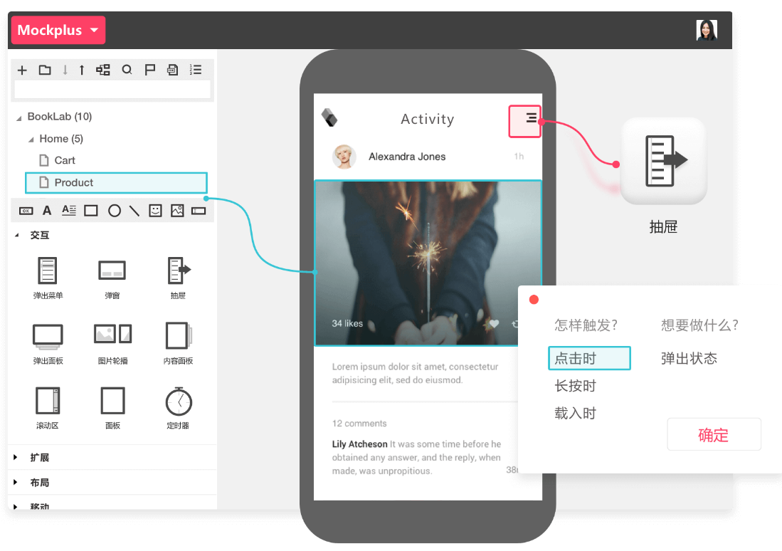 Mockplus(摹客)是一款简洁快速的原型图设计工具。适合软件团队、个人在软件开发的设计阶段使用。它的使用场景特点就是低保真,无需学习便可以快速上手并且功能够用,能够很好地表达自己的设计。从设计上,采取了隐藏、堆叠、组合等方式,把原本复杂的功能,精心安排。上手很容易,但随着你的使用,功能层层递进,你会发现更多适合自己的有用的功能。新手不会迷惑,熟手可以够用。从创新性来看,可直接实现设计和移动设备之间的通讯,直接预览,不需要任何第三方设备。在设计过程中,设计者拿出手机就可以随时和Mockplus对接,将原型传递到移动设备,观察原型在移动设备中的真实状态。总之这一款工具对新手是非常友好的,简单易懂快速上手。
