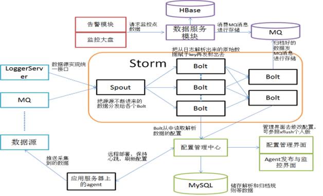 我们基于Storm和HBase设计了自己的实时监控平台,分钟级别实时展现系统执行状况和业务数据(架构如图2所看到的),包括下面几个主要部分。