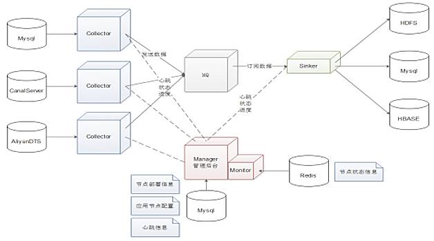 数据抽取用开源的canal实现,MySQL binlog改为Row模式,将canal抽取的binlog解析为MQ消息,打包传输给MQ。