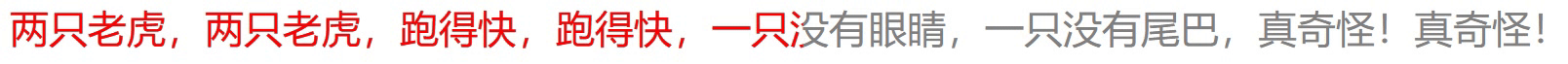 1 <body> 2 <style> 3 span { 4 /* background:linear-gradient(to right,rgb(119, 149, 173),rgb(148, 139, 139)); */ 5 color: gray; 6 position: relative; 7 font-size: 16px; 8 } 9 span::before { 10 content:attr(text); 11 display: inline-block; 12 position: absolute; 13 top: 0; 14 /* width: 100%; */ 15 /* height: 100%; */ 16 background: linear-gradient(to right, red, red) no-repeat 0 0; 17 background-size: 0% 100%; 18 -webkit-background-clip: text; 19 background-clip: text; 20 color: transparent; 21 animation: gc linear 13s infinite; 22 } 23 @keyframes gc { 24 0% { 25 background-size: 0% 100%; 26 } 27 100% { 28 background-size: 100% 100%; 29 } 30 } 31 </style> 32 <span text="两只老虎,两只老虎,跑得快,跑得快,一只没有眼睛,一只没有尾巴,真奇怪!真奇怪!">两只老虎,两只老虎,跑得快,跑得快,一只没有眼睛,一只没有尾巴,真奇怪!真奇怪!</span> 33 </body>