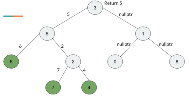 Input: root = [3,5,1,6,2,0,8,null,null,7,4] Output: [2,7,4] Explanation: We return the node with value 2, colored in yellow in the diagram. The nodes coloured in blue are the deepest leaf-nodes of the tree. Note that nodes 6, 0, and 8 are also leaf nodes, but the depth of them is 2, but the depth of nodes 7 and 4 is 3.