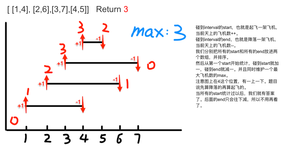 给出飞机的起飞和降落时间的列表,用序列 interval 表示. 请计算出天上同时最多有多少架飞机?