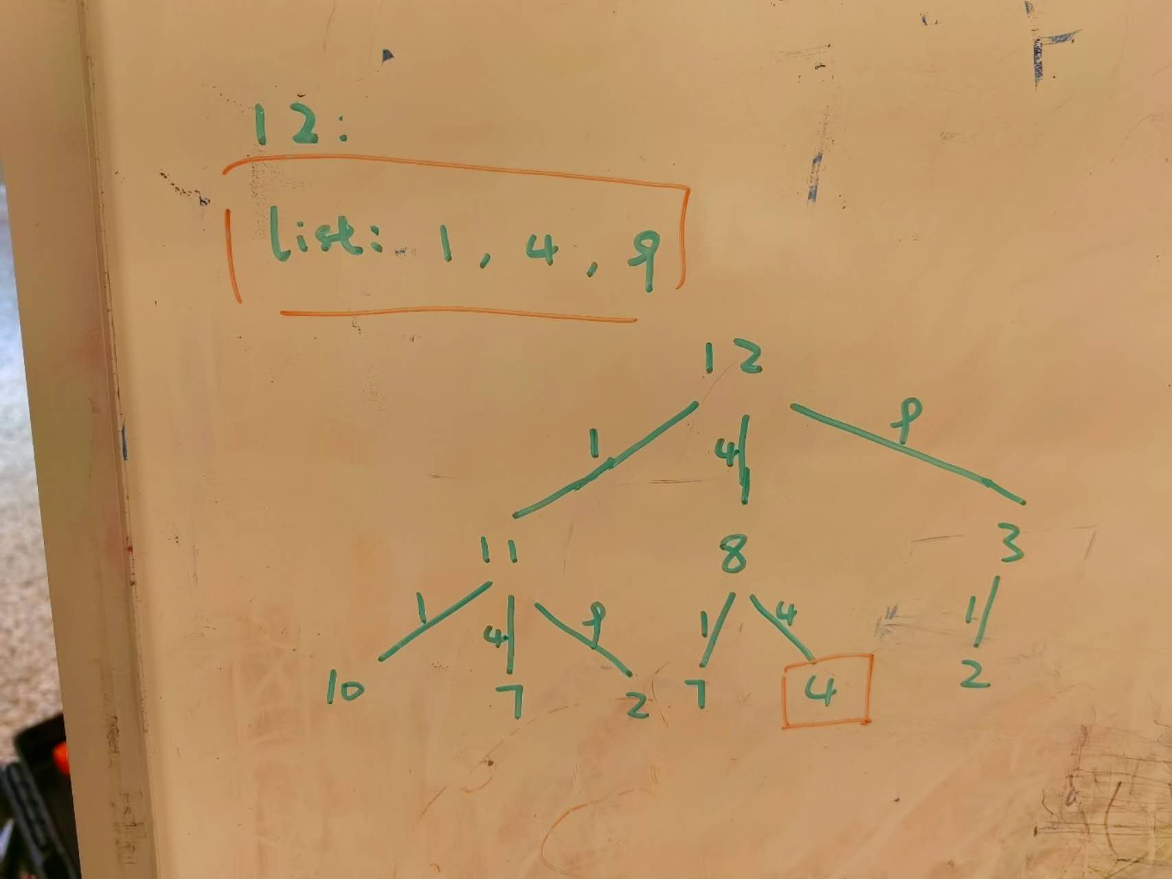 Set<Integer> visit = new HashSet(); visit.add(n); while(!visit.isEmpty()){ Set<Integer> temp = new HashSet(); for(Integer num:visit){ for(Integer square:list){ if(num-square==0) return level; else if(num-square<0) break; else temp.add(num-square); } visit = temp; } level++; } return level; } }