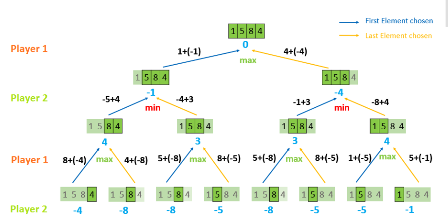 class Solution { public boolean PredictTheWinner(int[] nums) { return helper(nums, 0, nums.length - 1, new Integer[nums.length][nums.length]) >= 0; } private int helper(int[] nums, int left, int right, Integer[][] mem) { if(left == right) return nums[left]; if(mem[left][right] != null) return mem[left][right]; int leftR = nums[left] - helper(nums, left + 1, right, mem); int rightR = nums[right] - helper(nums, left, right - 1, mem); mem[left][right] = Math.max(leftR, rightR); return mem[left][right]; } }