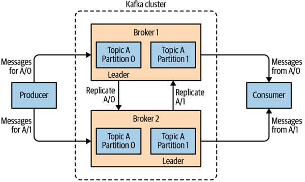 为了高可用,partition level还可以有多个replica,leader+followers,跟数据库类似,写需要通过leader去写,但是读(consum)可以通过leader或者任一follower